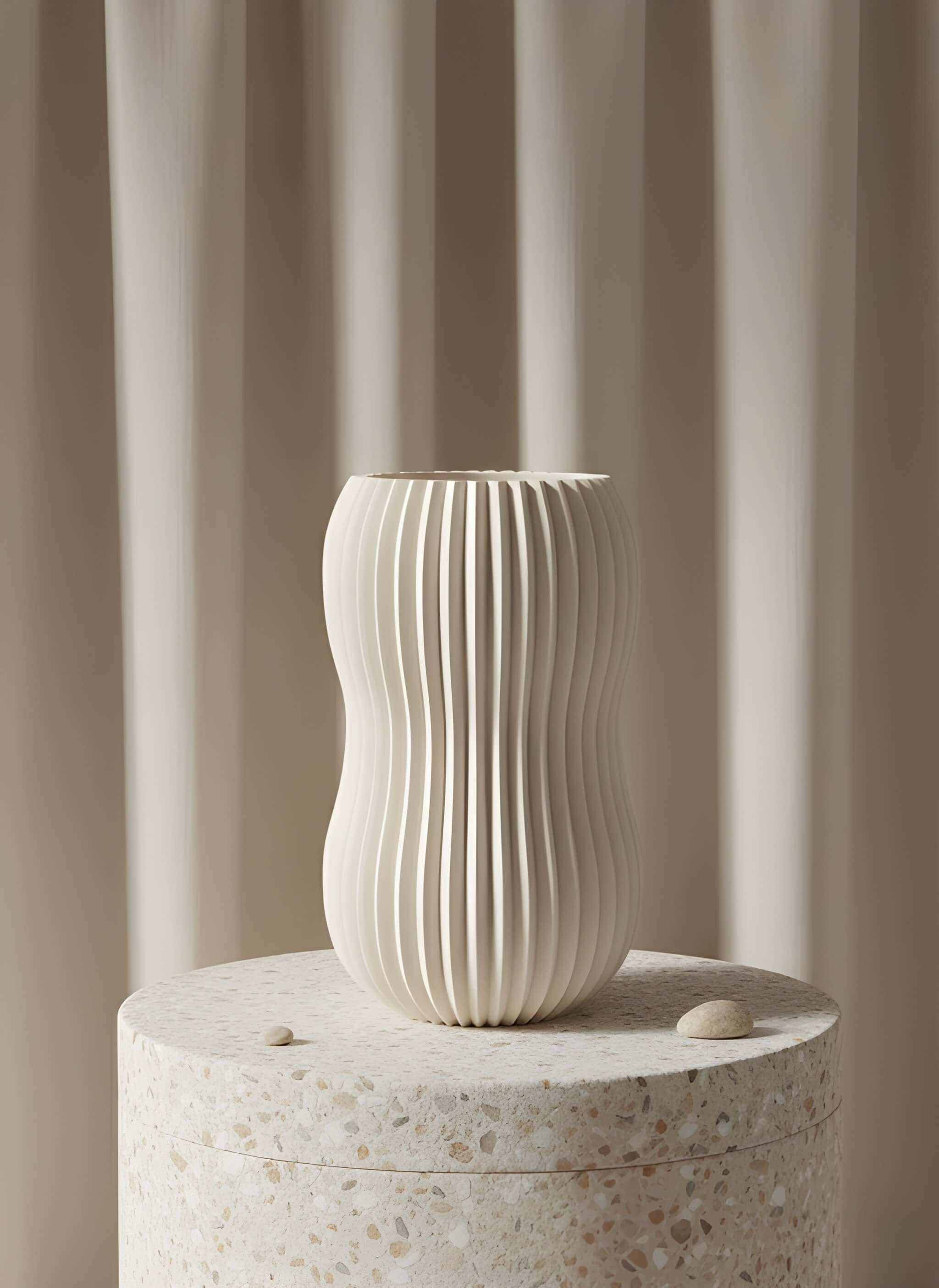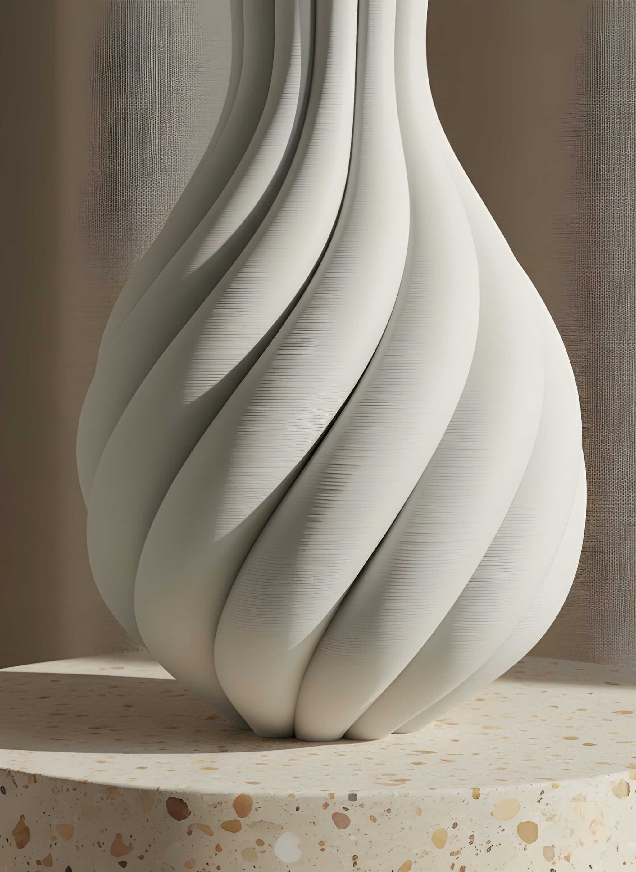 Visokorezolucijsko FDM 3D printanje stvara glatke, čvrste vaze bez grubih rubova; galerijska kvaliteta, keramički dojam.